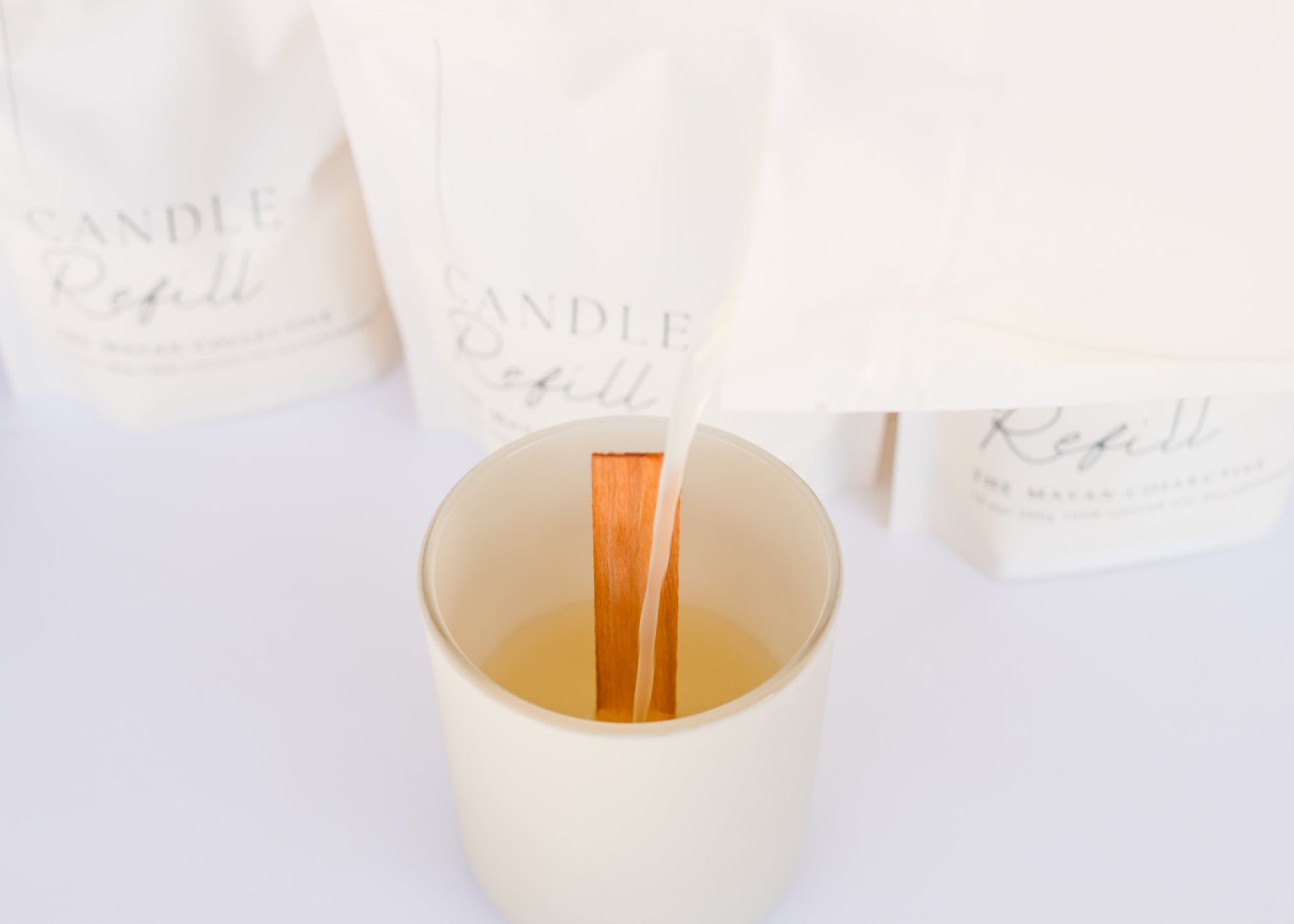Warm up your refill pouch with hot water bath over the stove using a double boiling method until wax is completely melted. Do not over heat! Wick your TMC signature jar by placing your wooden wick in the middle of your jar. Pour your melted wax on your wicked signature jar and let it sit over night. Trim your wooden wick to 1/4", light and enjoy!